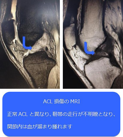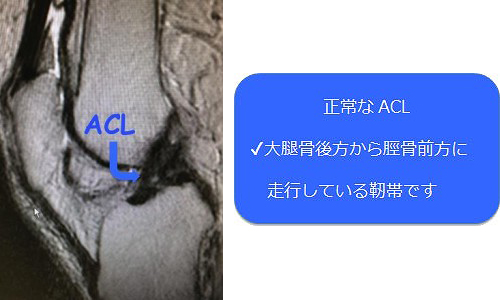 前十字靭帯(ACL)とは大腿骨(太ももの骨)の後方から脛骨(すねの骨)の前方にあり、大腿骨に対して脛骨が前方に移動したり、回旋したりすることを制御しており膝関節の安定性を担っています。