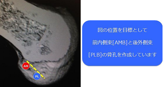 正常なACLは前内側束(AMB)、後外側束(PLB)の2つの束でできています。そのため元々のACLにより近似させるため、大腿骨と脛骨に2つずつ骨孔を作成し再建します(2重束再建法)。
