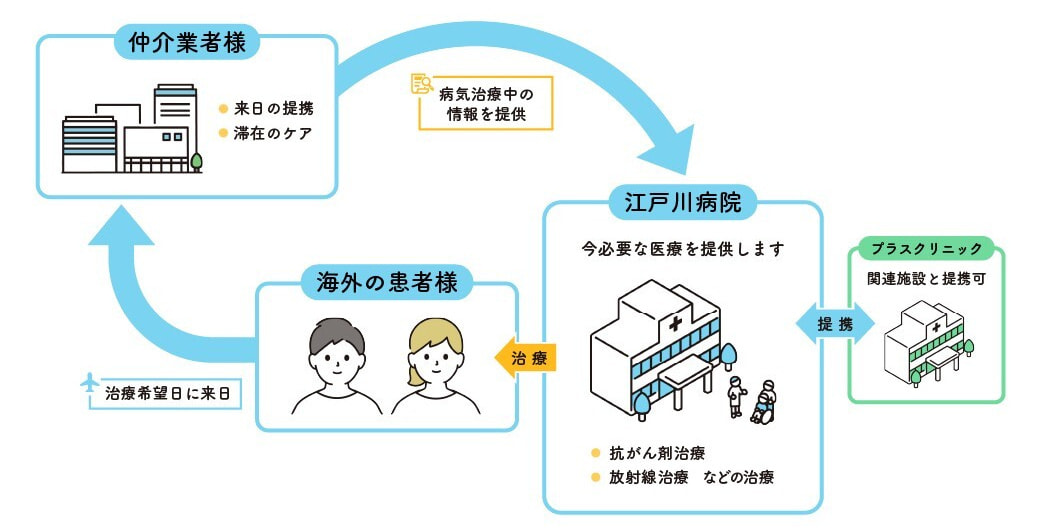 基本の受け入れは渡航医療仲介業者と連携して対応させていただいております。