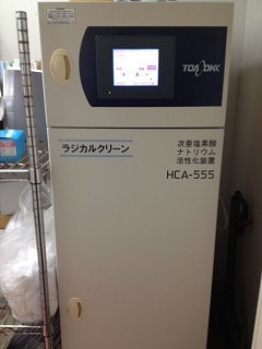 ラジカルクリーン 次亜塩素酸ナトリウムを単に水希釈せずに低濃度の酢酸を混ぜて希釈することでpHを酸性側にコントロールする装置です。