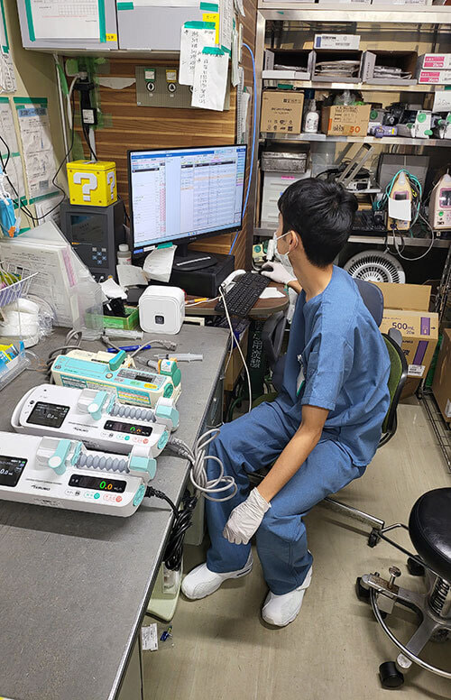 ME室の主な業務は、穿刺をはじめコンソール、セントラル、RO装置の操作管理、患者様の採血データ、ダイアライザ等の物品管理です。