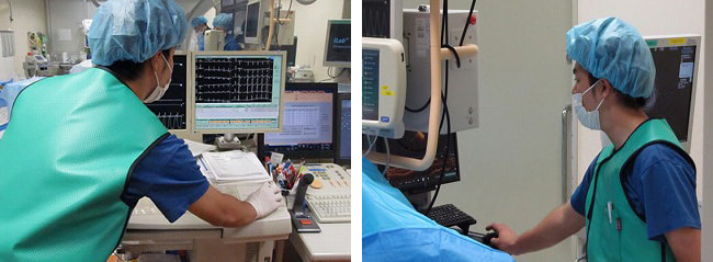 当院の心臓カテーテル検査室は2部屋あり、医師、看護師、放射線技師、臨床検査技師、臨床工学技士の多くの職種が一緒に働いています。MEは主に虚血系疾患を担当しているので、緊急カテーテルはほぼMEが担当します。 手技中は心電図を貼るところから始まり、ポリグラフにてバイタルのモニタリング、各種デバイスの物品出し、IVUS、NIRS-IVUS、OCT、OFDI、FFR、iFR、V-A ECMO(PCPS)、IABP、ロータブレータ、IVL、OASなどの操作を行っています。
