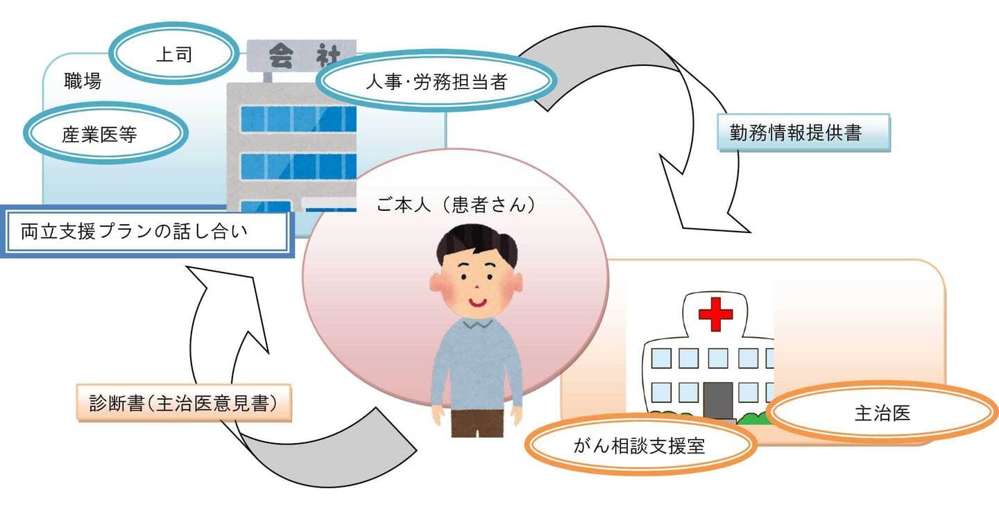 【両立支援の流れ】 患者さんを通して、職場と医療機関が文書をやり取り、もしくは対面相談を通じて、就労と治療の両立を支援していきます。