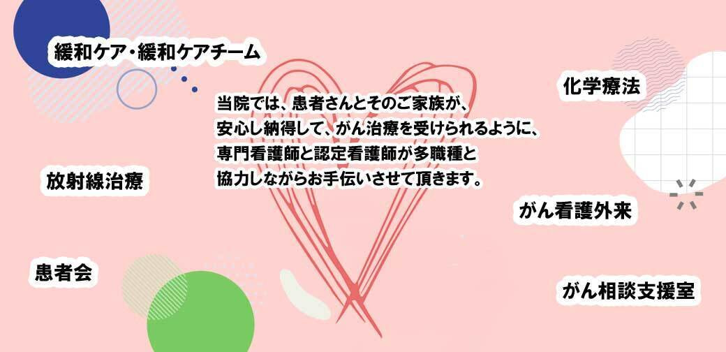 がんと言われて、からだもこころもつらいと感じていませんか?そのつらさ我慢しないでください。当院は緩和ケアを受けることができます。緩和ケア専門医・緩和ケア認定看護師・がん専門看護師が活動しています。